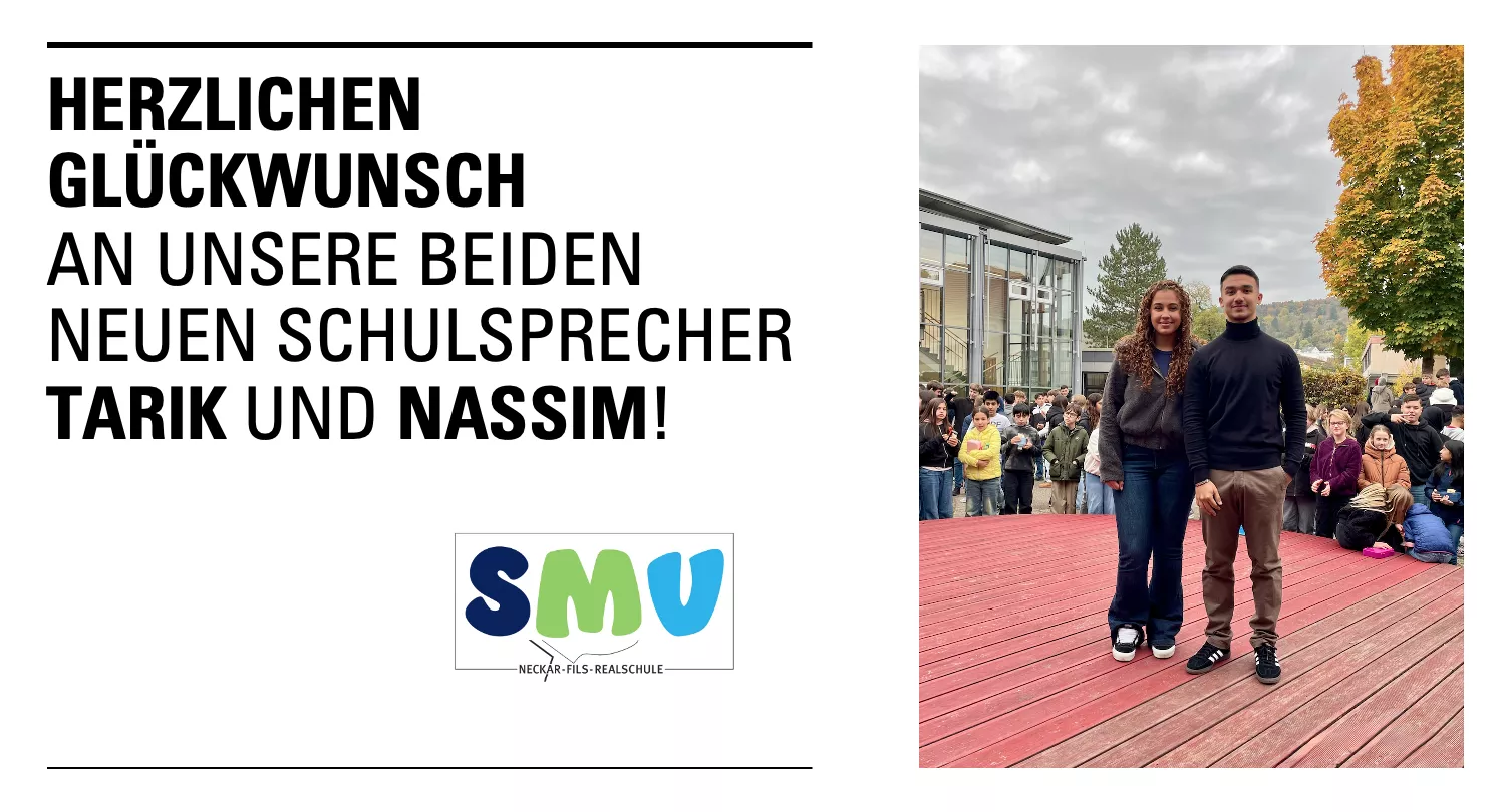 Schulsprecher der SMV im Schuljahr 2025/26 sind Nassim Haji Mohammad aus der 10b und Tarik Balija aus der 10b.